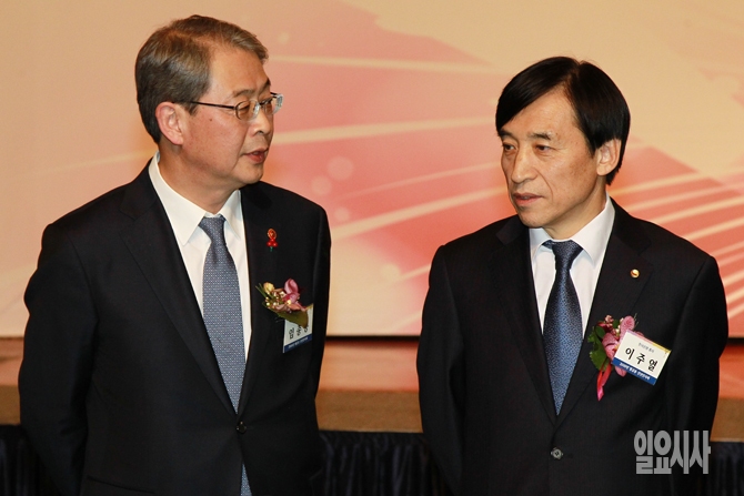 임종룡 금융위원장(왼쪽)과 이주열 한국은행 총재가 5일 오후 서울 소공동 롯데호텔에서 열린 2016년 범금융 신년인사회에서 대화를 나누고 있다.