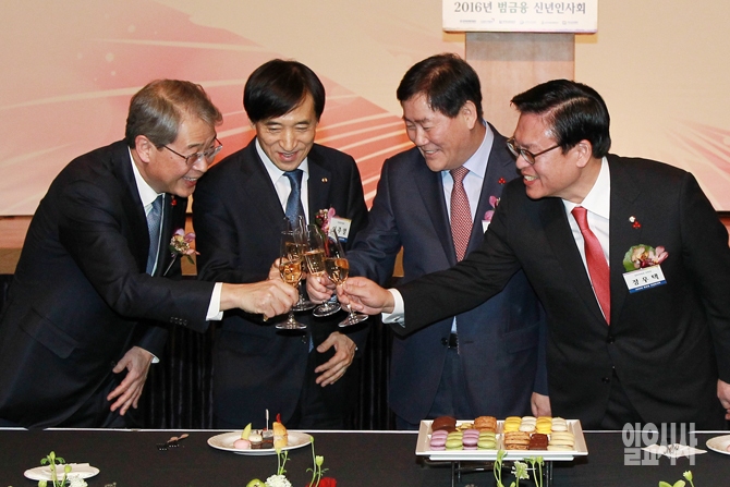 임종룡 금융위원장, 이주열 한국은행 총재, 최경환 경제부총리 겸 기획재정부 장관, 정우택 국회 정무위원장(왼쪽부터)이 5일 오후 서울 소공동 롯데호텔에서 열린 2016년 범금융 신년인사회에서 건배를 하고 있다.