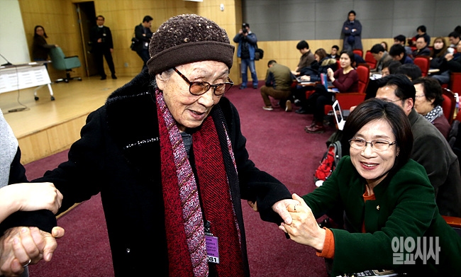 5일, 서울 여의도 국회 의원회관서 열린 '긴급진단 2015 한일외교장관회담의 문제점' 긴급 토론회 도중 위안부 피해자인 김복동 할머니가 발언 후 제자리로 돌아오며 정의당 김제남 의원(사진 오른쪽) 등의 부축을 받고 있다.