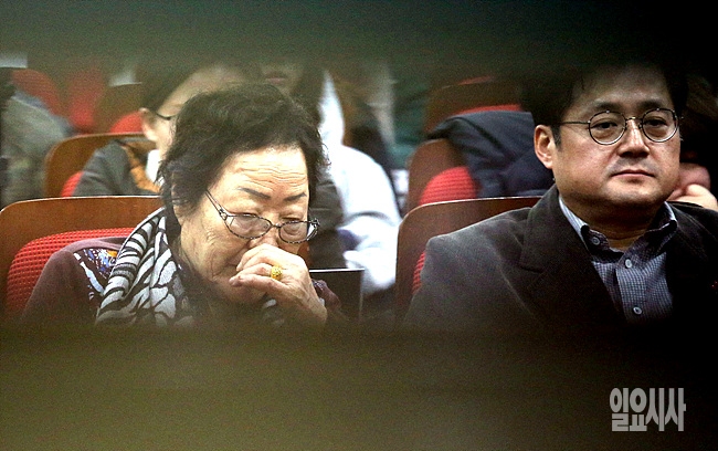 5일, 서울 여의도 국회 의원회관서 '긴급진단 2015 한일외교장관회담의 문제점' 긴급 토론회가 열리고 있는 가운데 위안부 피해자인 이용수 할머니가 깊은 슬픔에 잠겨 있다.