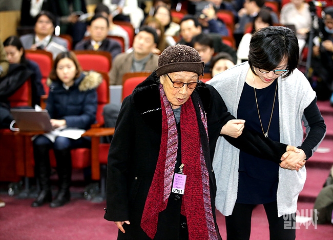 5일, 서울 여의도 국회 의원회관서 열린 '긴급진단 2015 한일외교장관회담의 문제점' 긴급 토론회 도중 위안부 피해자인 김복동 할머니가 문제점 발언 후 관계자의 도움을 받으며 자리로 이동하고 있다.