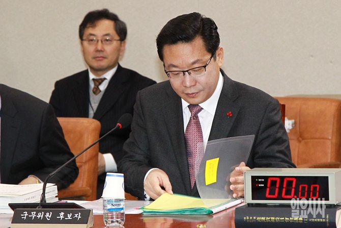 주형환 산업통상자원부 장관 후보자가 6일 오전 서울 여의도 국회에서 열린 국회 산업통상자원위원회 주형환 산업통상자원부 장관 후보자 인사청문회에서 자료를 검토하고 있다.