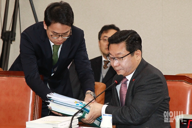 주형환 산업통상자원부 장관 후보자가 6일 오전 서울 여의도 국회에서 열린 국회 산업통상자원위원회 주형환 산업통상자원부 장관 후보자 인사청문회에서 관계자에게 청문회 자료를 건내받고 있다.