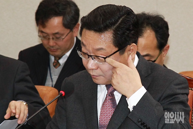 주형환 산업통상자원부 장관 후보자가 6일 오전 서울 여의도 국회에서 열린 국회 산업통상자원위원회 주형환 산업통상자원부 장관 후보자 인사청문회에서 손가락으로 눈을 만지고 있다.