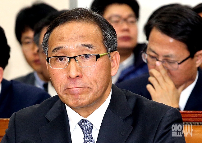 6일, 서울 여의도 국회서 홍윤식 행정자치부장관 후보자에 대한 인사청문회가 열린 가운데 홍 후보자가 의원들의 질의에 잠시 난처한 표정을 짓고 있다.