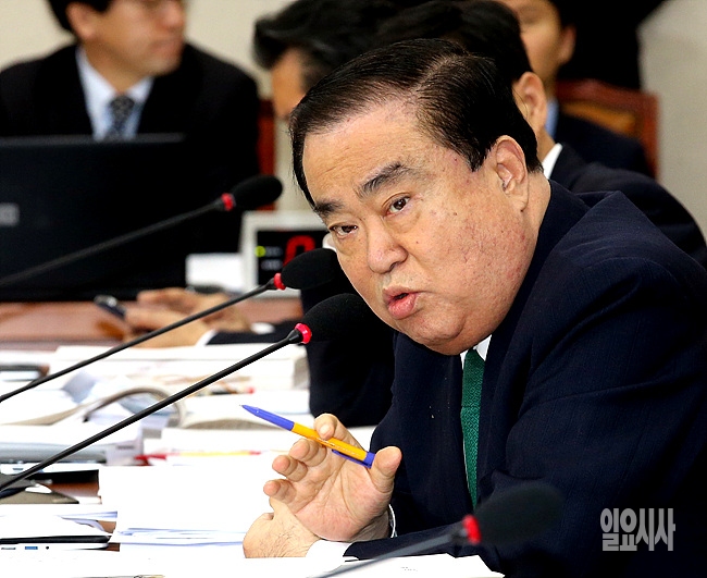 6일, 서울 여의도 국회서 홍윤식 행정자치부장관 후보자에 대한 인사청문회가 열린 가운데 더불어민주당 문희상 의원이 홍 후보자에게 질의하고 있다.