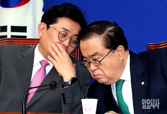6일, 서울 여의도 국회서 북한 수소폭탄 실험 관련 더불어민주당 긴급 대책회의 도중 전병헌 최고위원(사진 왼쪽)이 문희상 의원과 귓속말을 나누고 있다.