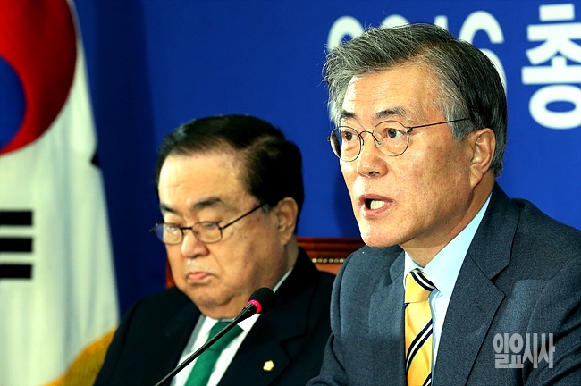6일, 서울 여의도 국회서 북한 수소폭탄 실험 관련 더불어민주당 긴급 대책회의 도중 문재인 대표(사진 오른쪽)가 모두발언을 하고 있다.