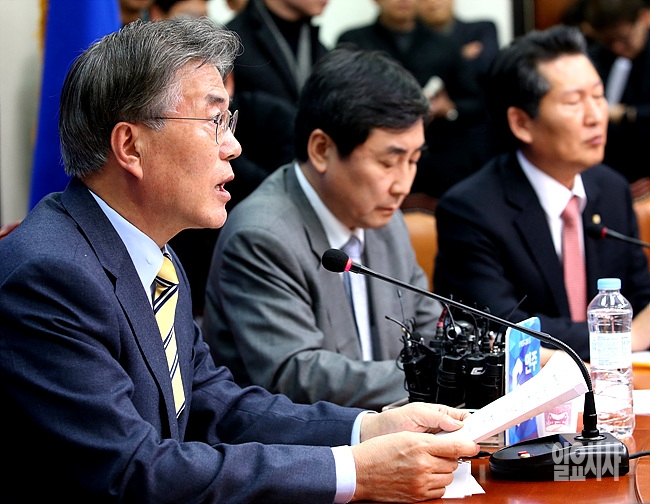 6일, 서울 여의도 국회서 북한 수소폭탄 실험 관련 더불어민주당 긴급 대책회의 도중 문재인 대표가 발언을 하고 있다.