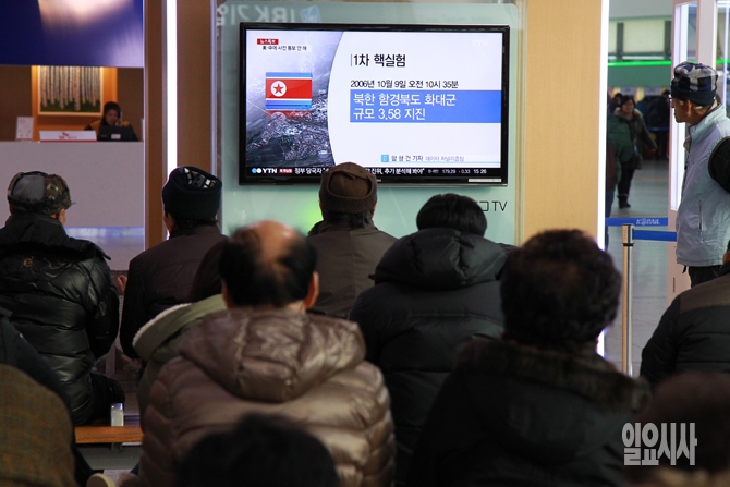 북한이 특별 중대 보도로 첫 수소탄 핵실험에 성공했다고 밝힌 6일 오후 서울역 대합실에서 시민들이 북한의 핵실험 관련 뉴스를 보고 있다.