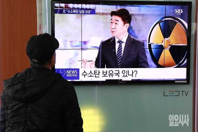 북한이 특별 중대 보도로 첫 수소탄 핵실험에 성공했다고 밝힌 6일 오후 서울역 대합실에서 시민들이 북한의 핵실험 관련 뉴스를 보고 있다.