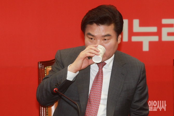 원유철 새누리당 원내대표가 7일 오전 서울 여의도 국회에서 열린 새누리당 최고위원회의에서 물을 마시고 있다.
