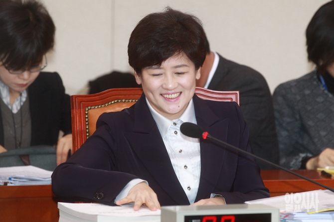 강은희 여성가족부 장관 후보자가 7일 오전 서울 여의도 국회에서 열린 국회 여성가족위원회 전체회의 강은희 여성가족부 장관 후보자 인사청문회에서 자료를 준비하며 환하게 웃고 있다.