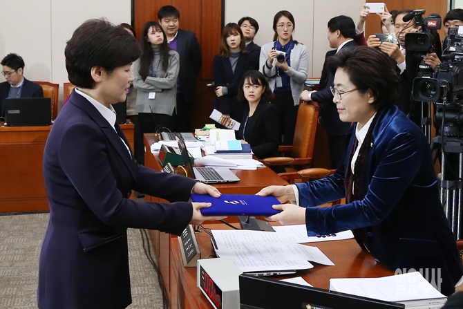 강은희 여성가족부 장관 후보자가 7일 오전 서울 여의도 국회에서 열린 국회 여성가족위원회 전체회의 강은희 여성가족부 장관 후보자 인사청문회에서 선서문을 전달하고 있다.