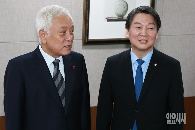 무소속 안철수(오른쪽), 김한길 의원이 7일 오후 서울 여의도 국회의원회관에서 가진 오찬회동에서 대화를 나누고 있다.
