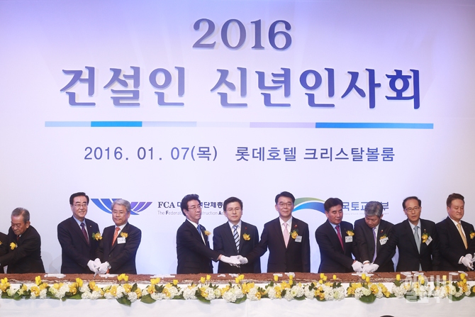 최삼규 대한건설단체총연합회장, 황교안 국무총리, 강호인 국토교통부장관 등이 7일 오후 서울 소공동 롯데호텔에서 열린 '2016 건설인 신년인사회'에서 포토타임을 갖고 있다.