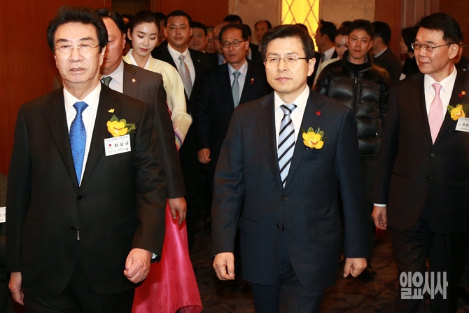 최삼규 대한건설단체총연합회장, 황교안 국무총리, 강호인 국토교통부장관(왼쪽부터)이 7일 오후 서울 소공동 롯데호텔에서 열린 '2016 건설인 신년인사회'에 입장하고 있다.