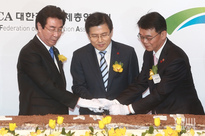 최삼규 대한건설단체총연합회장, 황교안 국무총리, 강호인 국토교통부장관(왼쪽부터)이 7일 오후 서울 소공동 롯데호텔에서 열린 '2016 건설인 신년인사회'에서 떡을 썰고 있다.