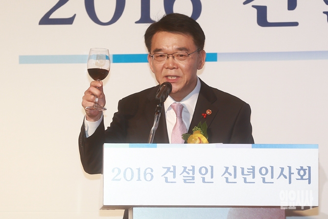 강호인 국토교통부 장관이 7일 오후 서울 소공동 롯데호텔에서 열린 '2016 건설인 신년인사회'에서 건배사를 하고 있다.