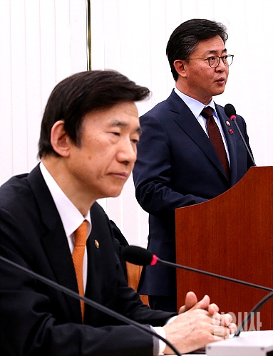 7일, 서울 여의도 국회서 열린 북한 수소폭탄 실험 발표 관련 긴급 현안보고에 출석한 홍용표 통일부장관이 회의에 앞서 업무보고를 하고 있다.