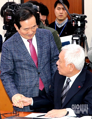 7일, 서울 여의도 국회서 열린 북한 수소폭탄 실험 발표 관련 긴급 현안보고에 참석한 더불어민주당 정세균 의원(사진 왼쪽)과 무소속 김한길 의원이 악수를 나누고 있다.
