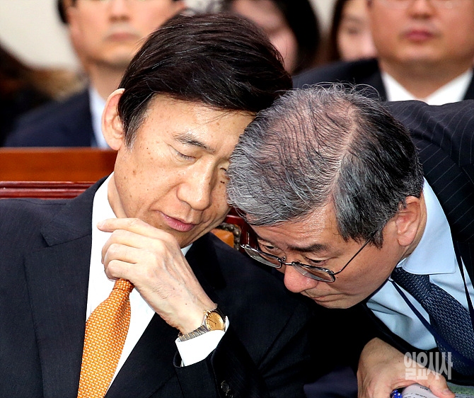 7일, 서울 여의도 국회서 열린 북한 수소폭탄 실험 발표 관련 긴급 현안보고에 출석한 윤병세 외교부장관이 회의 도중 관계자로부터 귓속말로 대화를 나누고 있다.