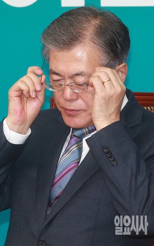 문재인 더불어민주당 대표가 8일 오전 서울 여의도 국회에서 열린 더불어민주당 최고위원회의에서 안경을 고쳐쓰고 있다.