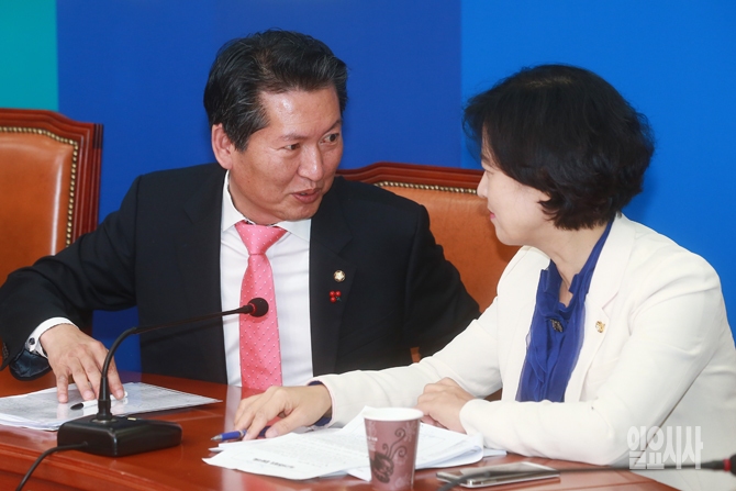 더불어민주당 정청래, 추미애 최고위원이 8일 오전 서울 여의도 국회에서 열린 더불어민주당 최고위원회의에서 대화를 나누고 있다.