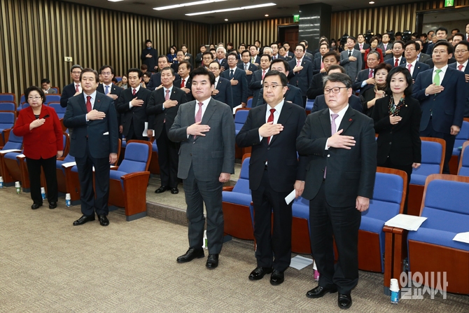 새누리당 지도부를 비롯한 소속 의원들이 8일 오후 서울 여의도 국회에서 열린 새누리당 의원총회에서 국민의례를 하고 있다.