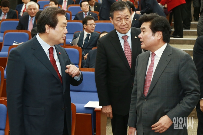 새누리당 김무성 대표(왼쪽)와 원유철 원내대표가 8일 오후 서울 여의도 국회에서 열린 새누리당 의원총회에서 대화를 나누고 있다.