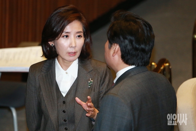 원유철 새누리당 원내대표와 나경원 국회 외통위원장(왼쪽)이 8일 오후 서울 여의도 국회에서 열린 본회의에서 대화를 하고 있다.