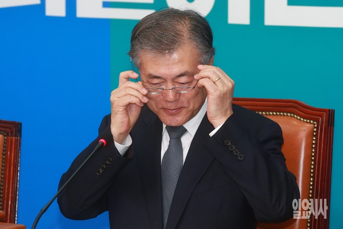 문재인 더불어민주당 대표가 18일 오전 서울 여의도 국회에서 열린 더불어민주당 최고위원회의에서 안경을 착용하고 있다.