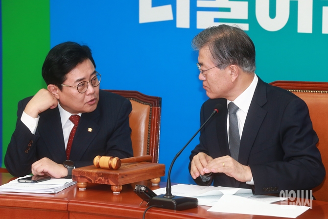 더불어민주당 문재인 대표와 전병헌 최고위원이 18일 오전 서울 여의도 국회에서 열린 더불어민주당 최고위원회의에서 대화를 나누고 있다.