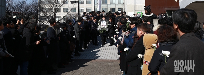 18일 오후 서울 구로구 성공회대학교에서 열린 고 신영복 성공회대 석좌교수의 영결식 후 고인의 영정과 유해가 추모객들의 배웅을 받으며 영결식장을 떠나고 있다.