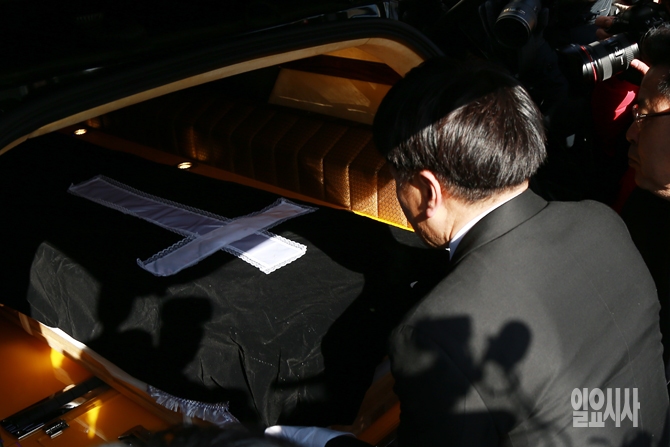 18일 오후 서울 구로구 성공회대학교에서 열린 고 신영복 성공회대 석좌교수의 영결식 후 고인의 유해가 운구차량에 실리고 있다.