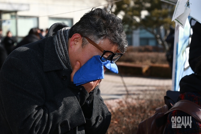 한 추모객이 18일 오후 서울 구로구 성공회대학교에서 열린 고 신영복 성공회대 석좌교수의 영결식 후 고인의 영정과 유해를 실은 운구차량이 떠나자 눈물을 흘리고 있다.