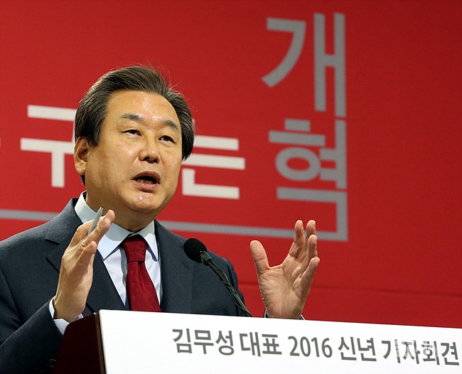 18일, 서울 여의도 국회서 새누리당 김무성 대표가 2016 신년 기자회견을 갖고 있다.