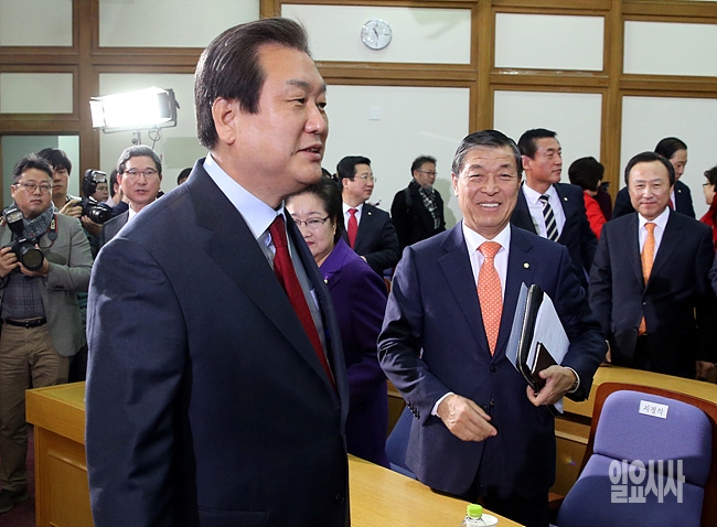 18일, 서울 여의도 국회서 새누리당 김무성 대표가 2016 신년 기자회견 직후 퇴장하고 있다.