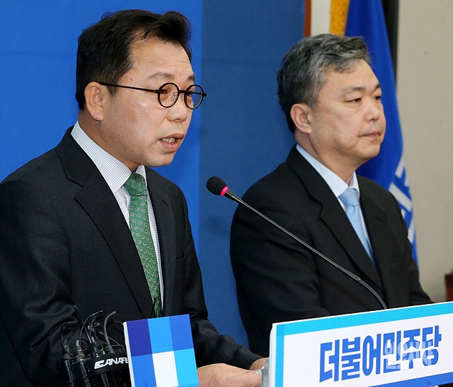 18일, 서울 여의도 국회 더불어민주당 대표실에서 오성규 전 서울시 시설관리공단 이사장(사진 왼쪽)과 김민영 전 참여연대 사무처장이 입당 기자회견을 갖고 있다.