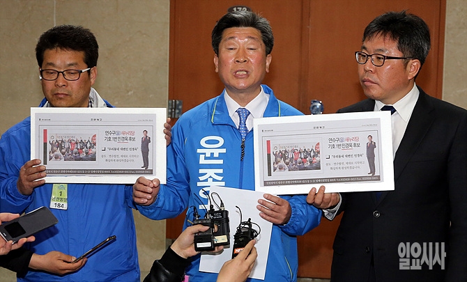 5일, 서울 여의도 국회 정론관 앞에서 더불어민주당 윤종기 후보가 새누리당 민경욱 후보에 대해 공직선거법을 위반했다며 사퇴 기자회견 직후 취재진의 질문에 답변하고 있다.
