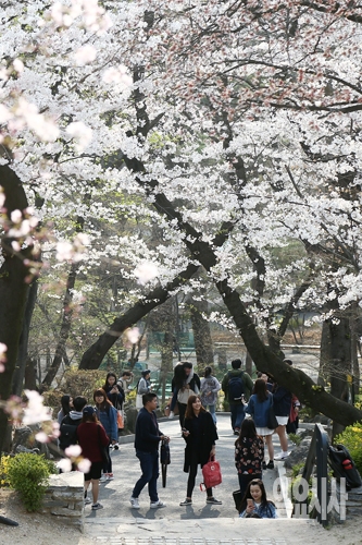봄꽃이 절정으로 이루고 있는 가운데 5일 오후 서울 동대문구 경희대학교에서 학생들이 벚꽃이 핀 캠퍼스를 거닐고 있다.