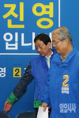 6일 오전 서울 용산구 진영 더불어민주당 후보의 선거사무소에서 열린 더불어민주당 중앙선거대책위원회의에 김종인 더불어민주당 비대위 대표가 입장하고 있다.