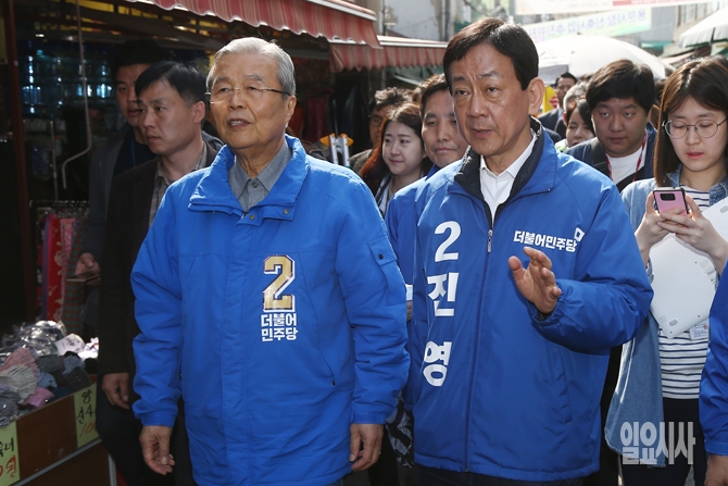 6일 오전 서울 용산구 용문시장에서 진영 더불어민주당 후보와 진후보의 지원유세에 나선 김종인 더불어민주당 비대위 대표가 대화를 나누고 있다.
