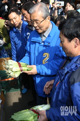 6일 오전 서울 용산구 용문시장에서 진영 더불어민주당 후보의 지원유세에 나선 김종인 더불어민주당 비대위 대표가 시장상인과 대화를 나누고 있다.