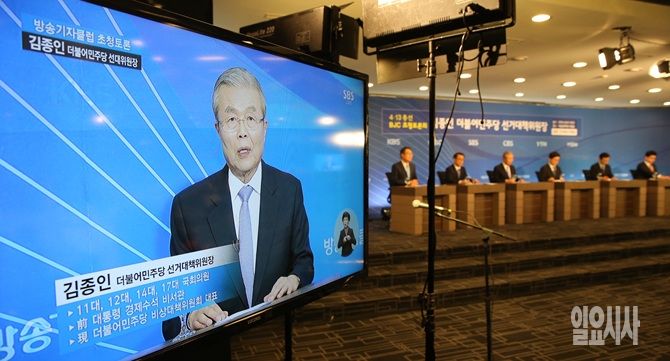 6일, 더불어민주당 김종인 선거대책위원장이 서울 종로구 세종문화회관에서 열린 방송기자클럽 초청 토론회에 참석해 기자들의 질문에 답변을 하고 있다.