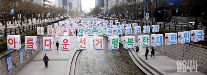 6일, 서울 중구 청계천에 '아름다운 선거 행복한 대한민국' '4월13일 제20대 국회의원선거' 등의 이색적인 선거 홍보물들이 설치돼 있다.