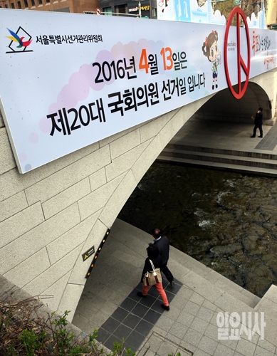 6일, 서울 중구 청계천에 '아름다운 선거 행복한 대한민국' '4월13일 제20대 국회의원선거' 등의 이색적인 선거 홍보물들이 설치돼 있다.