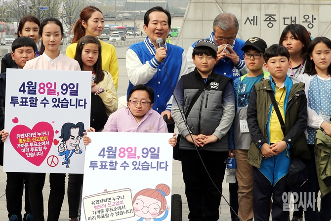6일, 서울 중구 광화문 세종대왕상 앞에서 정세균 더불어민주당 후보가 20대총선 사전 투표 독려 캠페인을 벌이고 있다.