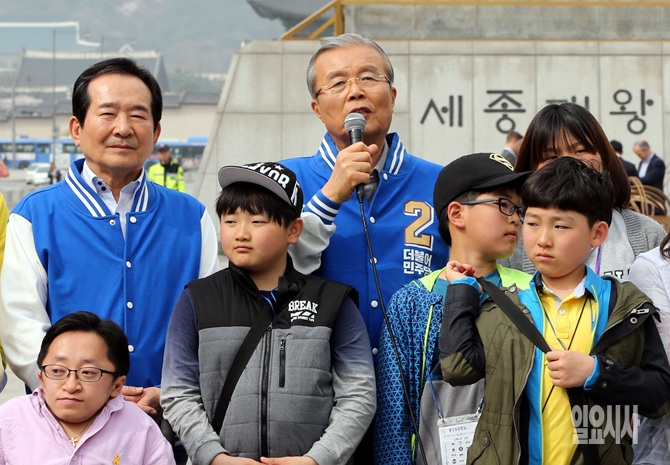 6일, 서울 중구 광화문 세종대왕상 앞에서 김종인 더불어민주당 선대위원장과 정세균 후보가 20대총선 사전 투표 독려 캠페인을 벌이고 있다.