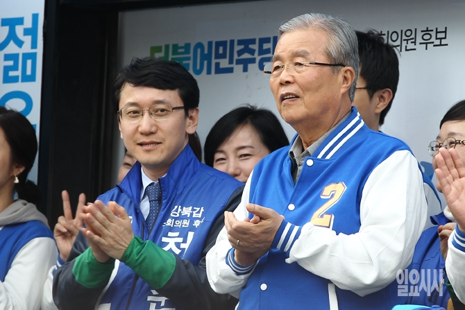 6일 오후 서울 강북구에서 천준호 더불어민주당 후보와 천후보의 지원유세에 나선 김종인 더불어민주당 비대위 대표가 박수를 치고 있다.